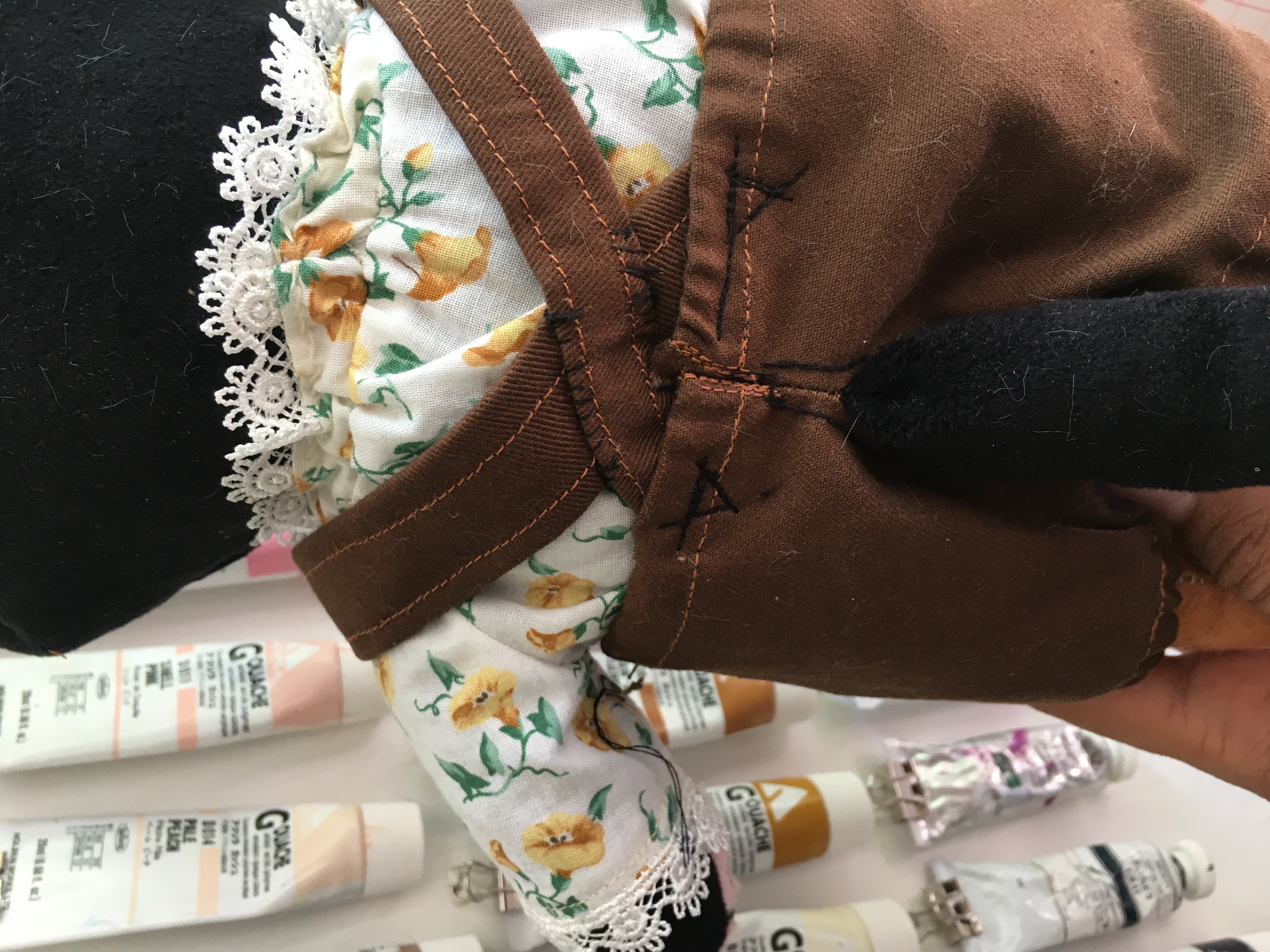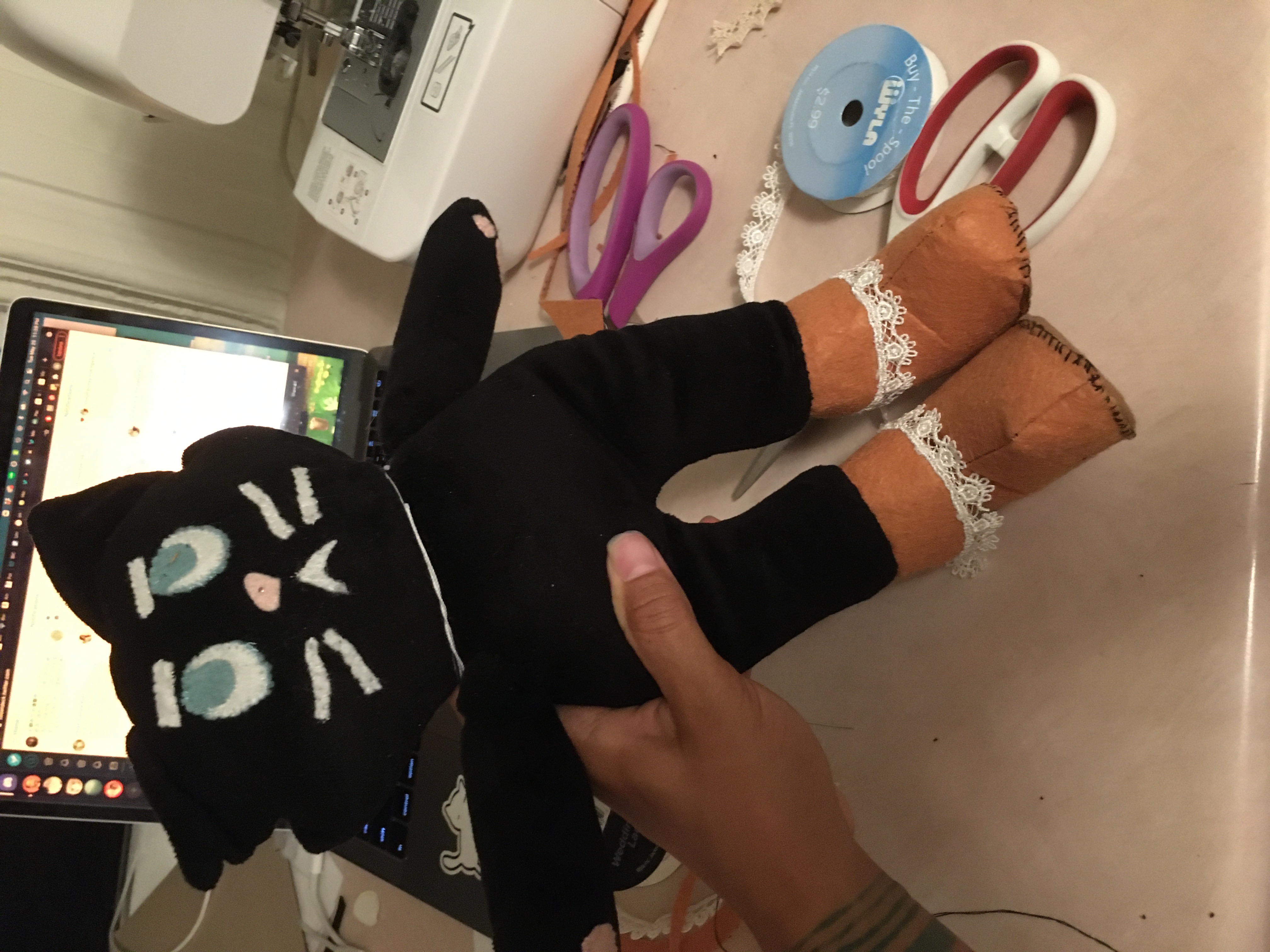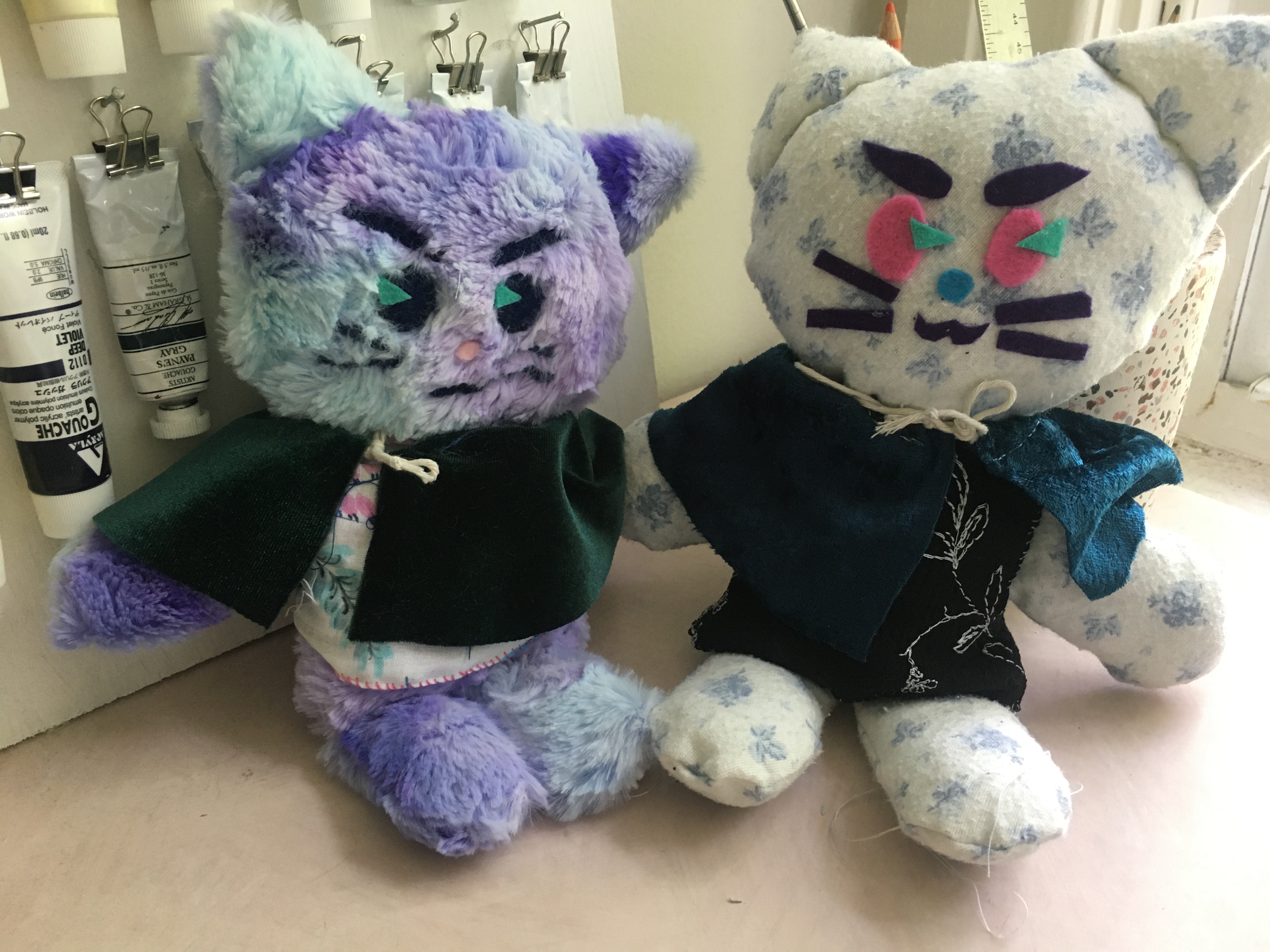 Puss are made from felt, bedsheets, thrifted fabrics and clothes, second-hand sewing materials, and some fabrics i actually spend real money on.